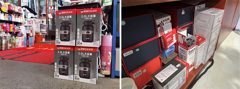 在門(mén)店里,我們發(fā)現(xiàn),保溫杯的陳列常常讓人眼花繚亂,品牌很難突出,店家就會(huì)把產(chǎn)品包裝當(dāng)成了陳列道具,堆放在店內(nèi)。所以,包裝本身又是終端陳列的道具,也是產(chǎn)品體驗(yàn)中的重要一環(huán)。